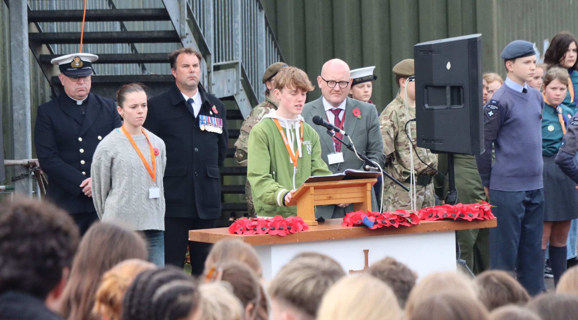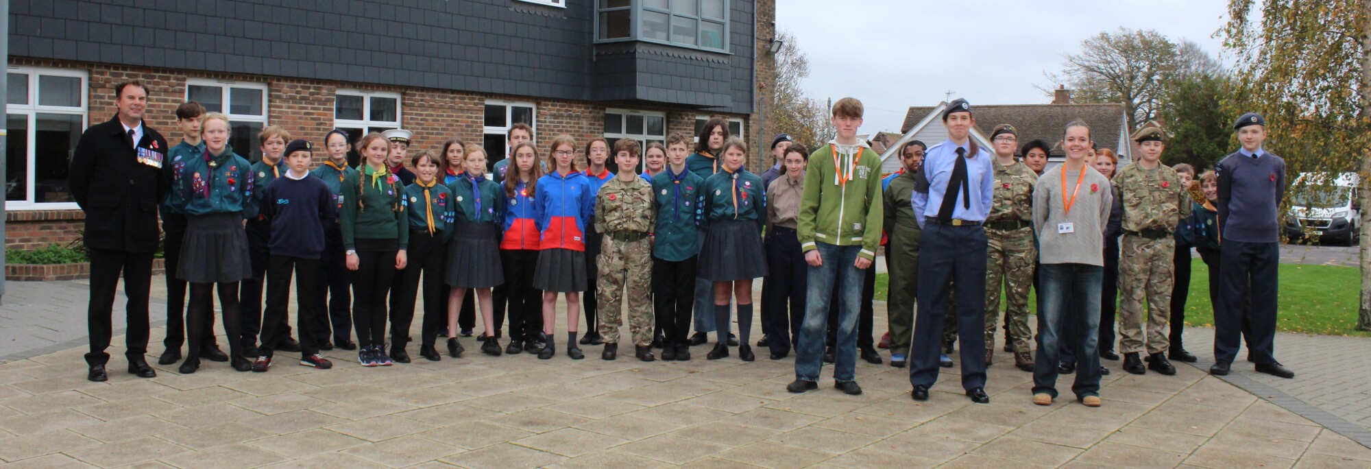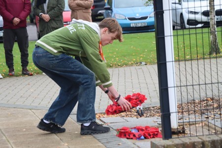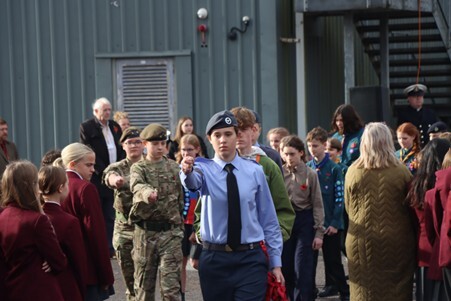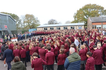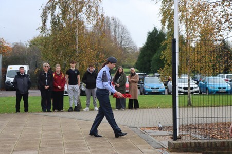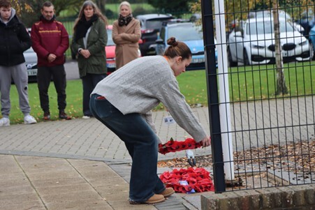 In what has become an annual moment of solemn commemoration, the whole School came together on the 11th November for a formal service of remembrance, this time on the Humanities Playground. As well as readings by Mr Hindman and our School Captains, Scarlette Guilfoyle and Rupert Reddington, there were also prayers from Father Phill, and the Kohima Epitaph from Mr Bonney (both ex-forces). We observed the two minutes silence at 11am, which was marked by the Last Post and Reveille, superbly played by Year 12 student Izzy Deans. A guard of honour made up of students who serve in uniformed organisations then accompanied the wreath laying party, as wreathes were laid by Mr Bonney and School Captains.