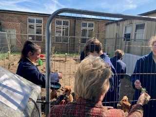 In the last week of term before Easter we held Bishop Luffa School's first ever 'Chicken Week'. We started the week with an Easter bake sale and were joined at lunchtime by the Rev Celia Woodruff for our Chicken Blessing. Father Phill also joined in and the hens and their run were blessed with Holy Water sprinkled on them with sprigs of Rosemary by the students. We expressed our gratitude for the joy the hens bring to students and prayed that they may continue to stay safe and healthy.